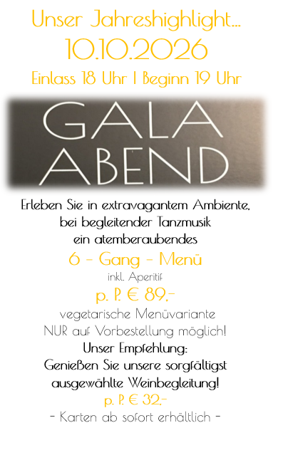 Der Gala-Abend findet am Samstag, den 10. Oktober 2026, statt. Der Einlass ist ab 18:00 Uhr und der offizielle Beginn um 19:00 Uhr. Tauchen Sie ein in eine unvergessliche Atmosphäre und erleben Sie einen einzigartigen Abend voller Genuss und Entertainment. Auf Wunsch bieten wir auch eine vegetarische Menüvariante an, die nach Vorbestellung erhältlich ist.